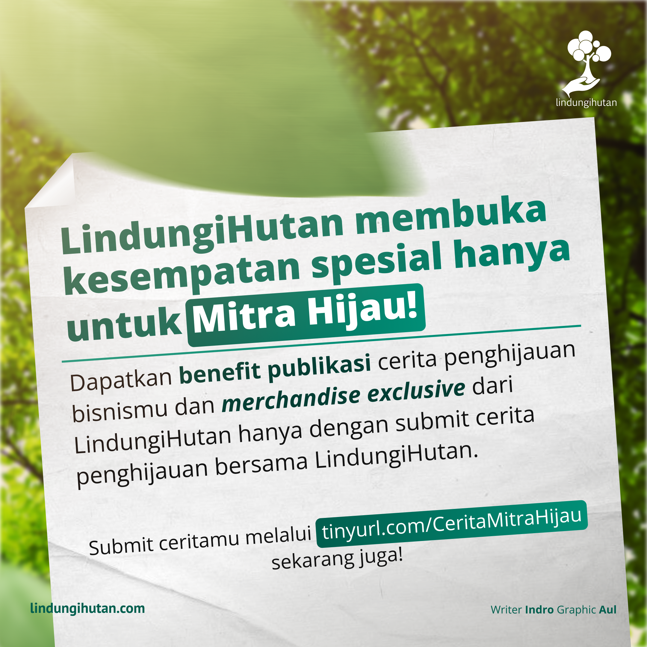 LindungiHutan mengajak brand dan perusahaan yang telah berpartisipasi dalam aksi penghijauan untuk berbagi cerita melalui sesi #CeritaMitraHijau, bagi cerita yang terpilih akan dipublikasikan di media sosial LindungiHutan dan menerima merchandise eksklusif sebagai apresiasi.
